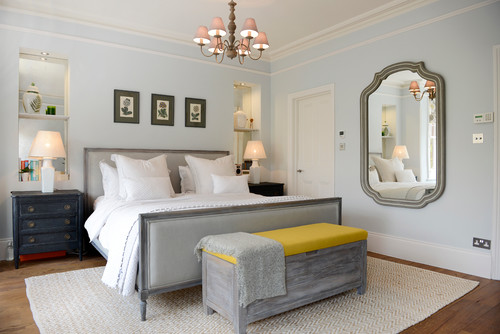 Pon un pie de cama. Además de un elemento estético, el pie de cama es también eficiente: permite sentarnos para vestirnos, mirar por la ventana y es una solución de almacenamiento temporal donde dejar una bata o la ropa de cama que no se usa al dormir.