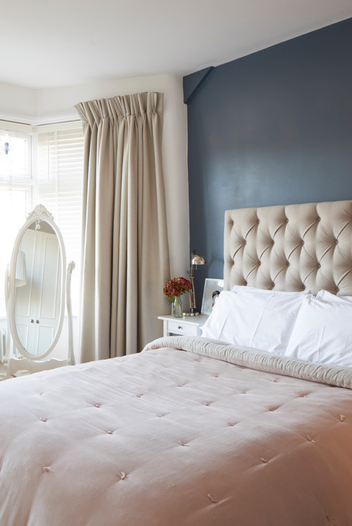 Un cabecero tapizado con capitoné y un gran espejo. Elige un cabecero de capitoné, estilo de tapizado de origen francés que los ingleses pusieron de moda en el siglo XIX. Al ser una superficie blanda, el cabecero funciona como respaldo para leer o ver pelis en la cama. Y para multiplicar la luz, a veces escasa en el norte de Europa, un espejo grande.