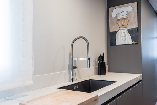Raquel García cree que cada material tiene sus virtudes y sus inconvenientes: “un material como el Corian permite crear superficies sin juntas por lo que puede ser la solución ideal para una cocina en ‘U’ en la que, de otro modo, habría muchos encuentros entre los planos de trabajo.