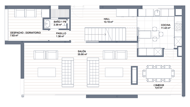 Las viviendas tienen un alto grado deversatilidad. En las dos promociones es posibleconfigurar la distribución finaltanto de la cocina como de los dormitorios o del sótano, donde se puede hacer unaplanta diáfana o distribuidapara sala de juegos o despacho.